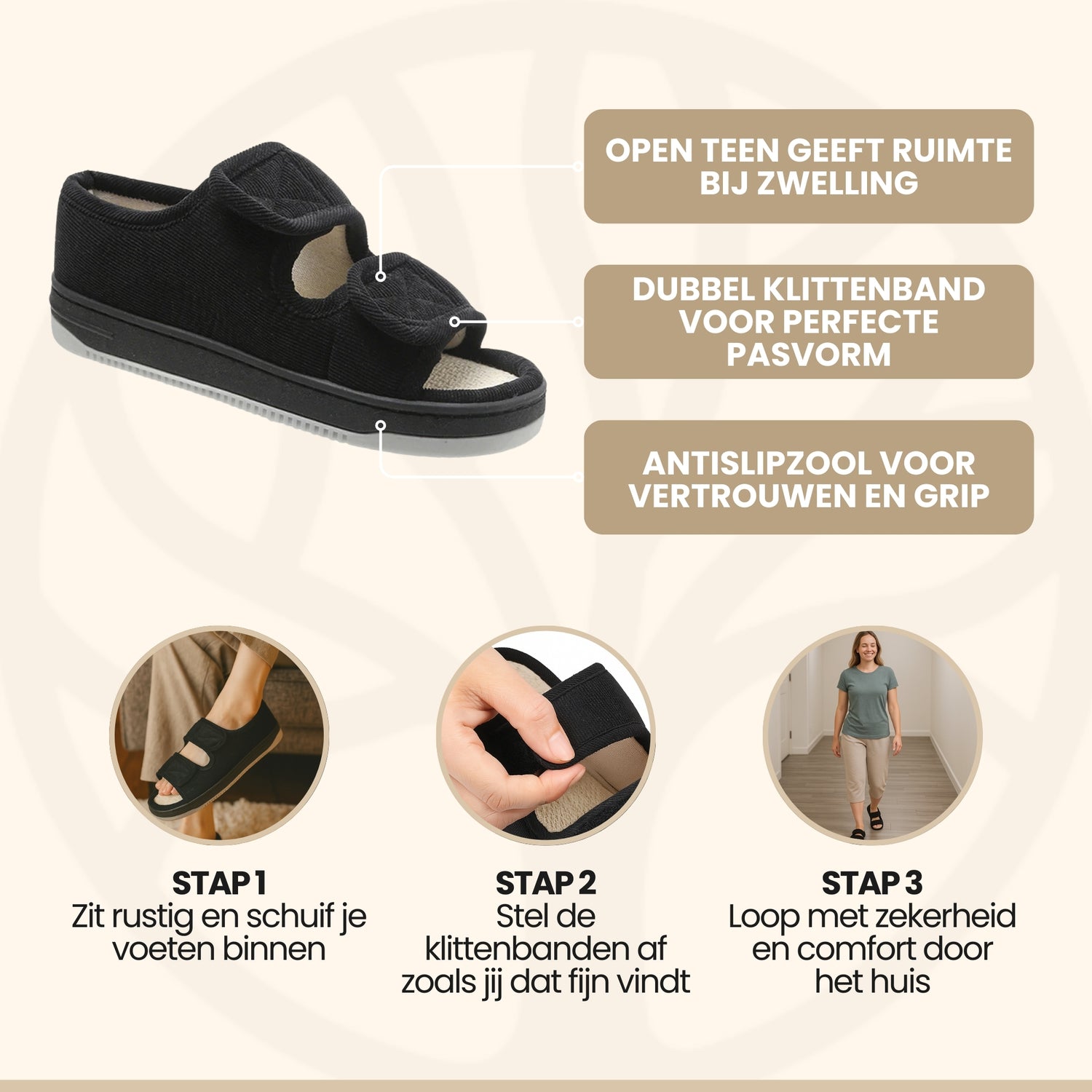 Je trekt ze makkelijk aan terwijl je zit, dankzij de dubbele klittenbandsluiting. Je stelt zelf in hoe strak je ze wilt. De open teen geeft extra ruimte bij zwelling. De zool is stroef genoeg voor glad laminaat of tegels. Geen gedoe meer, gewoon lopen met vertrouwen.