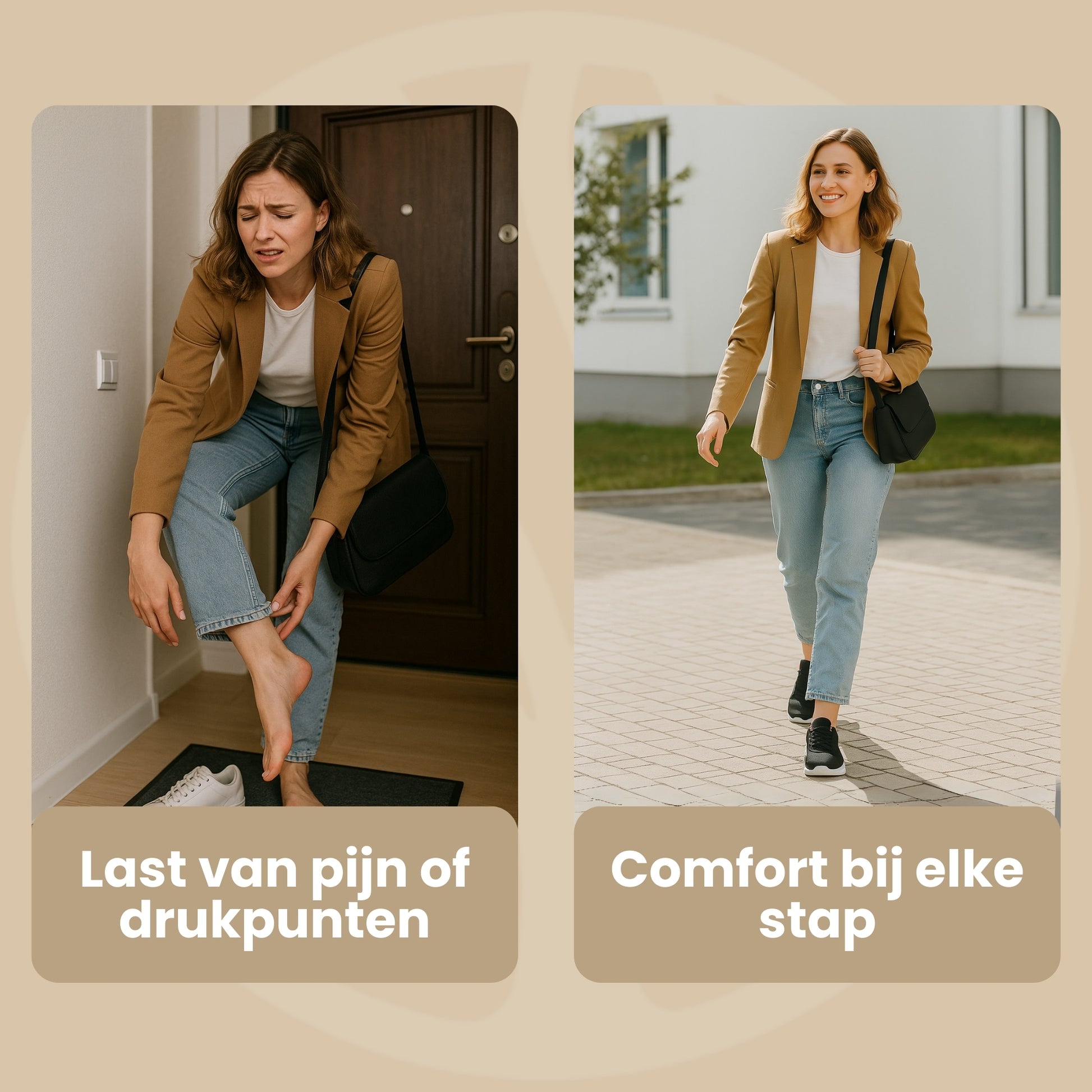Je komt thuis van werk of boodschappen en trekt je schoenen direct uit vanwege de pijn of vermoeidheid. Gewone sneakers lijken eerst lekker, maar geven geen steun. Na een paar uur voel je elke beweging. En dan moet je nog terug naar huis.