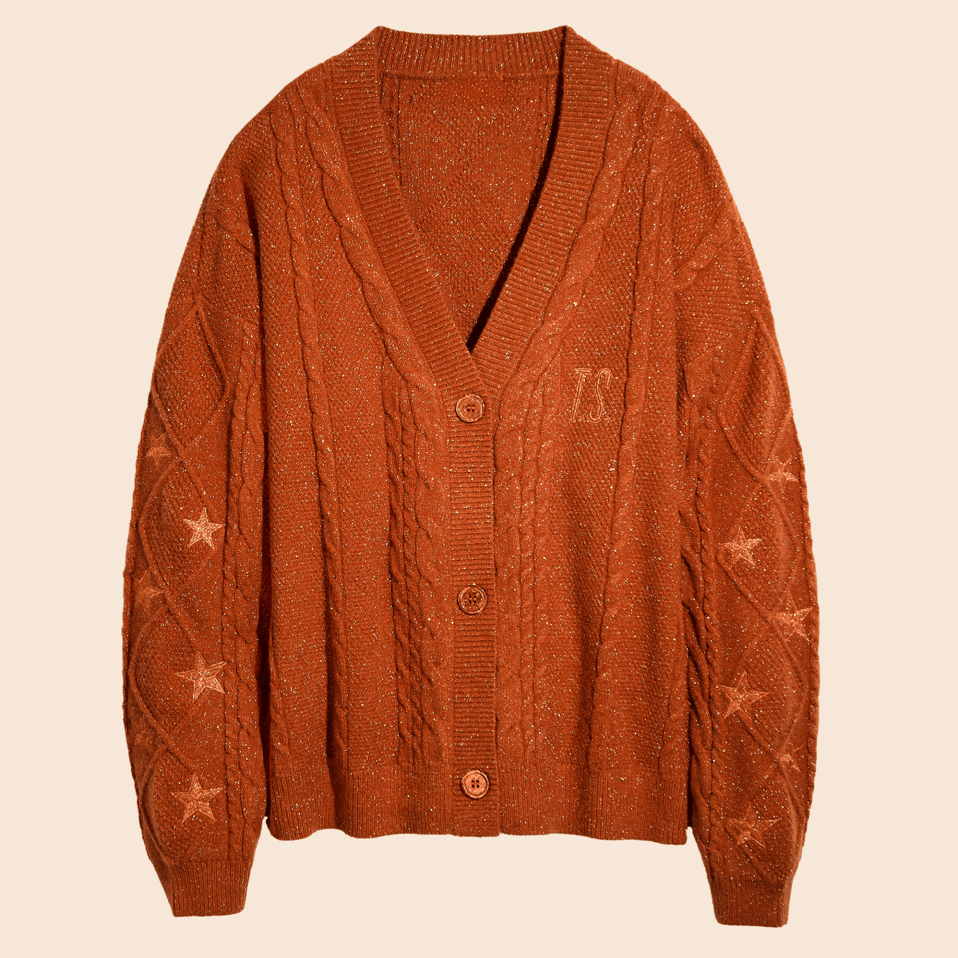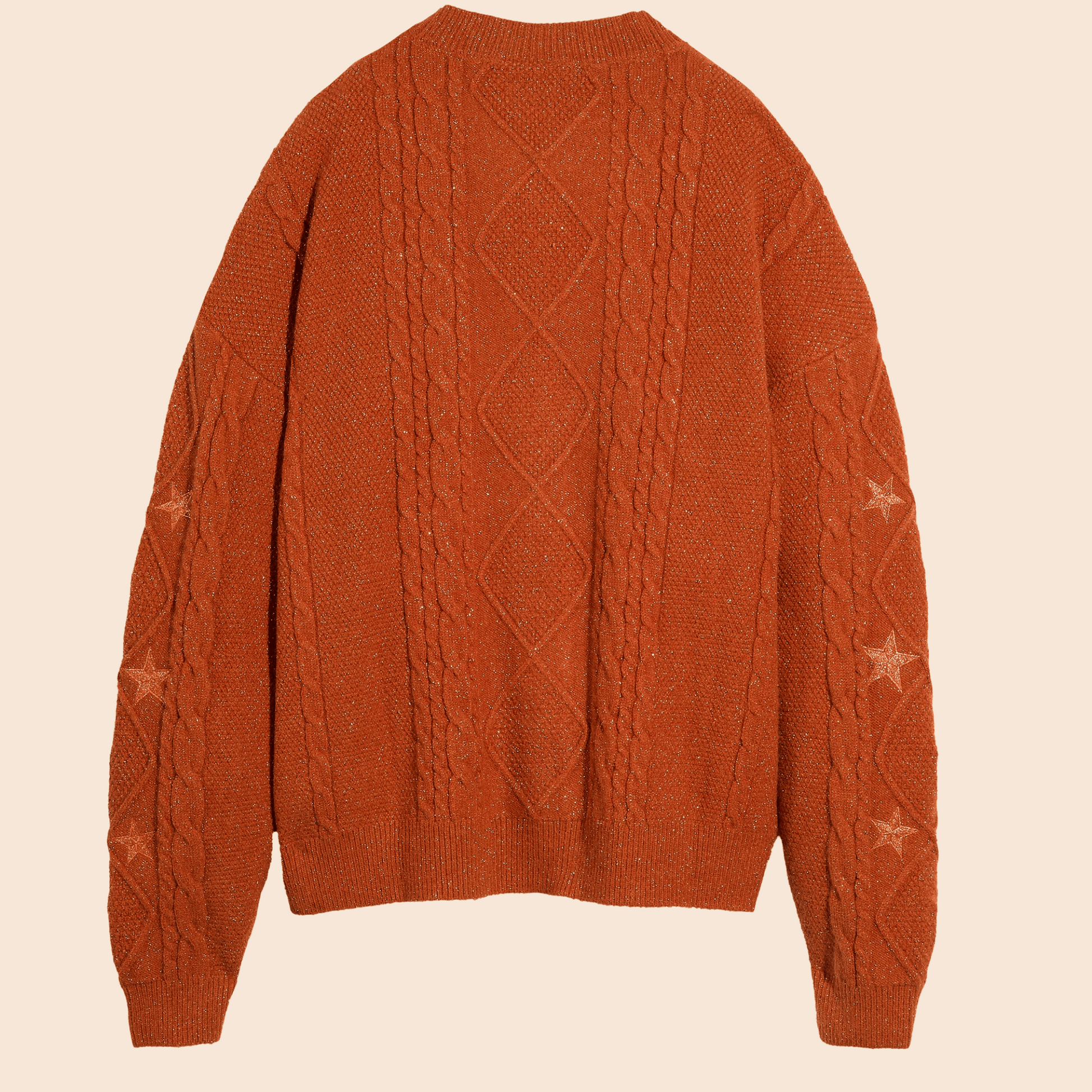 Deze gebreide cardigan is perfect voor het creëren van een comfortabele en modieuze look. Het heeft een mooie oranje kleur en een subtiel sterrenpatroon op de mouwen, wat zorgt voor een speelse uitstraling. Het zachte materiaal biedt warmte en comfort, terwijl de knoopsluiting een elegante afwerking geeft. Perfect voor de herfst en winter, ideaal voor casual of laagjes-stijlen.