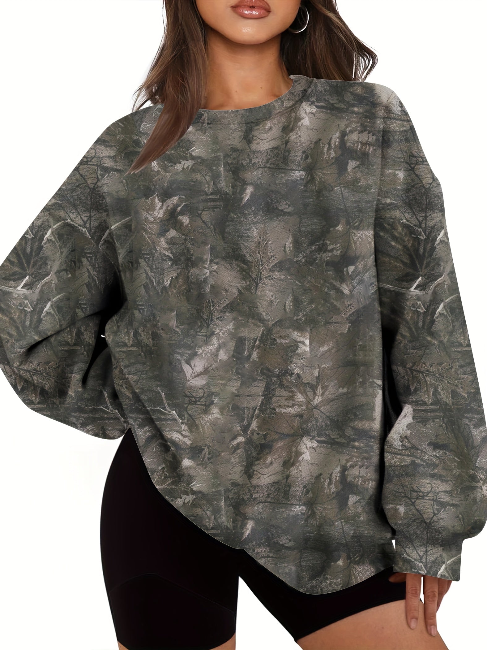 Deze dames trui met camouflageprint biedt zowel stijl als comfort. Het ontwerp met lange mouwen en een ronde hals zorgt voor een relaxte fit, terwijl de zachte stof je warm houdt. Perfect voor casual dagen of een comfortabele outfit in de herfst en winter, met een modieuze uitstraling.