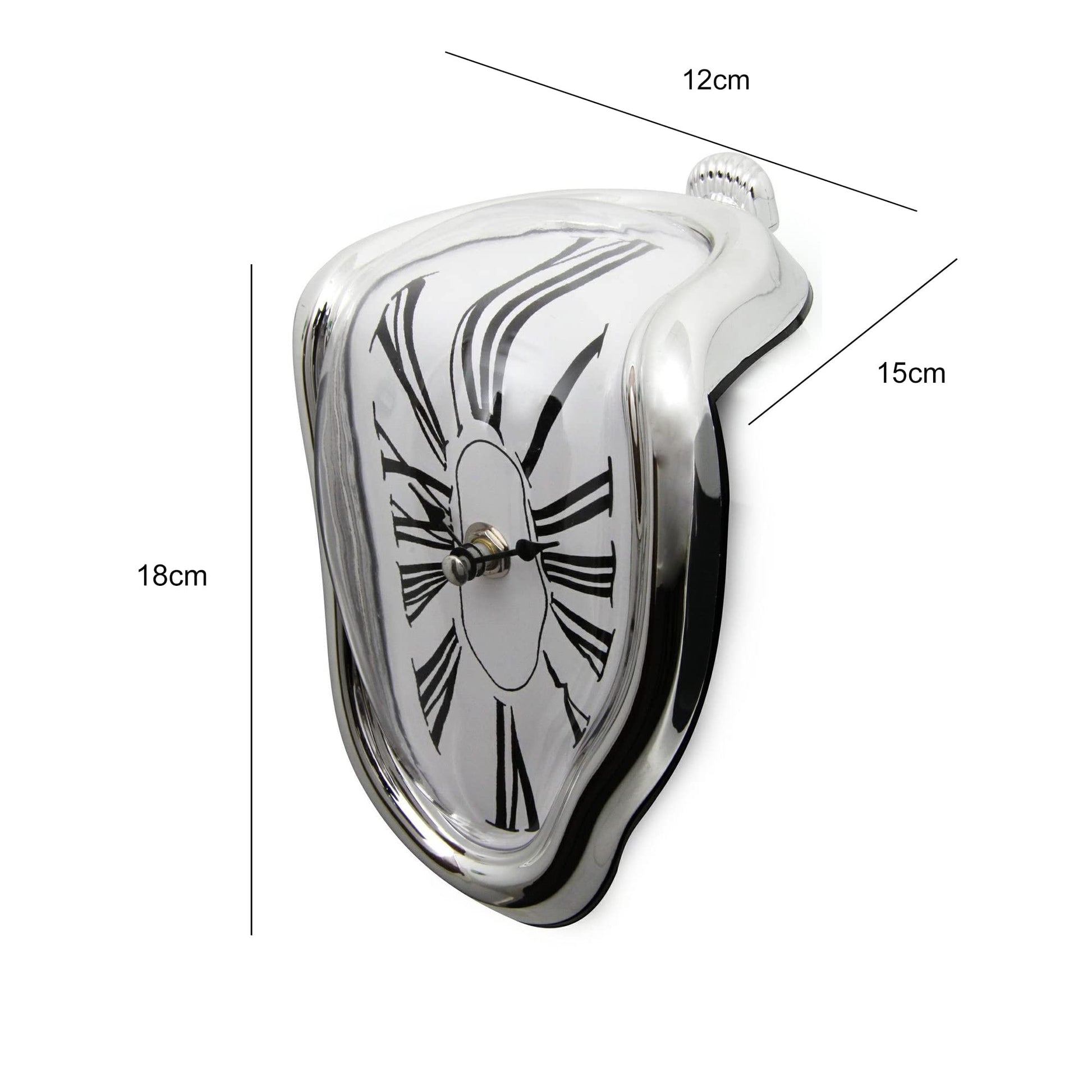 Deze moderne wandklok heeft een uniek vervormd ontwerp, geïnspireerd door de beroemde melting clocks van Salvador Dalí. Het is niet alleen een functionele klok, maar ook een kunstwerk dat elke ruimte een creatieve uitstraling geeft. De grote Romeinse cijfers zorgen voor een klassieke uitstraling, terwijl de gesmolten stijl een speelse twist toevoegt aan je interieur.