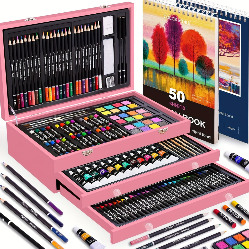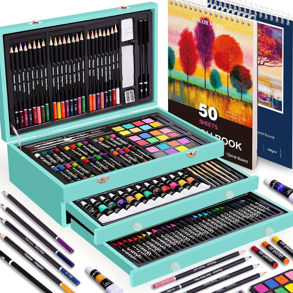 Deze uitgebreide kunstenaarsset bevat alles wat je nodig hebt om je creativiteit te uiten. De set wordt geleverd in een stijlvolle houten doos en bevat verschillende soorten materialen, waaronder kleurpotloden, aquarelverf, penselen en een schetsboek. Perfect voor zowel beginners als gevorderden, biedt deze set de tools voor het maken van prachtige kunstwerken.